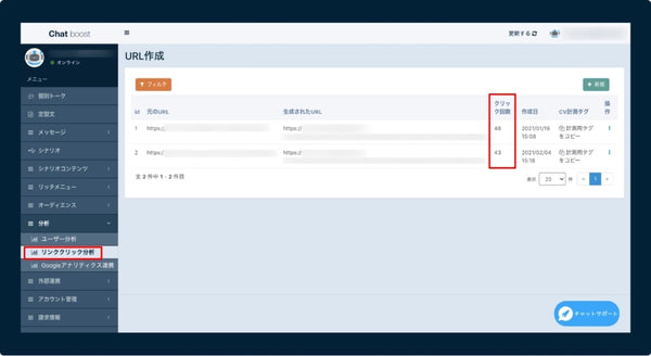 LINE上に設置されたリンクのクリック数を計測できるURLを発行できる機能です。