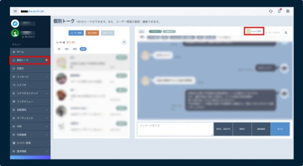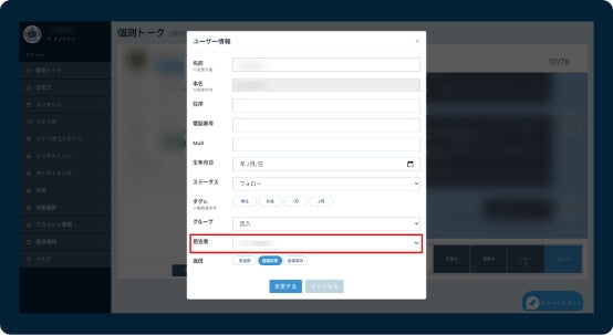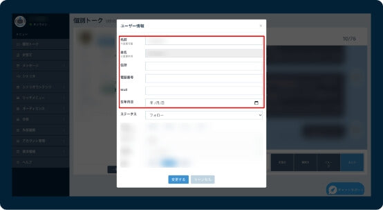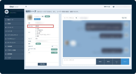 LINE登録ユーザーに紐づく様々な情報を詳細に管理し、それらを配信や個別対応で活⽤することができます。