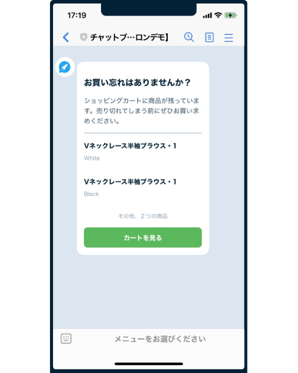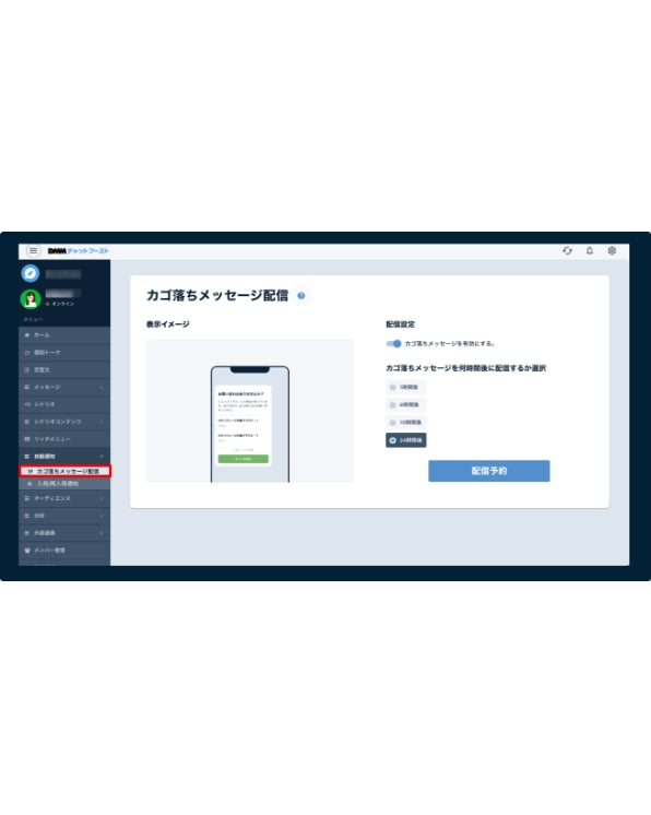 カートに商品を追加したまま離脱してしまったユーザーに、自動で通知メッセージ送ることができる機能です。